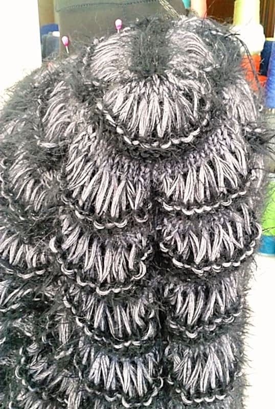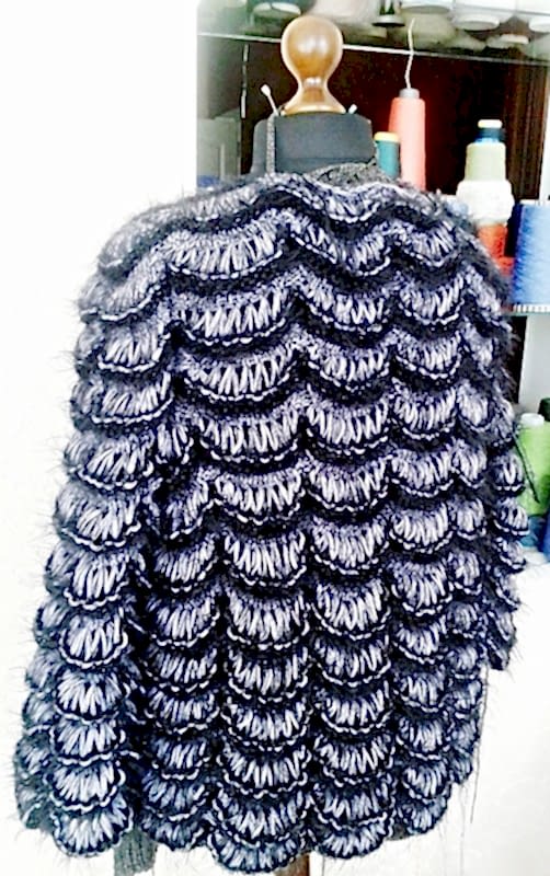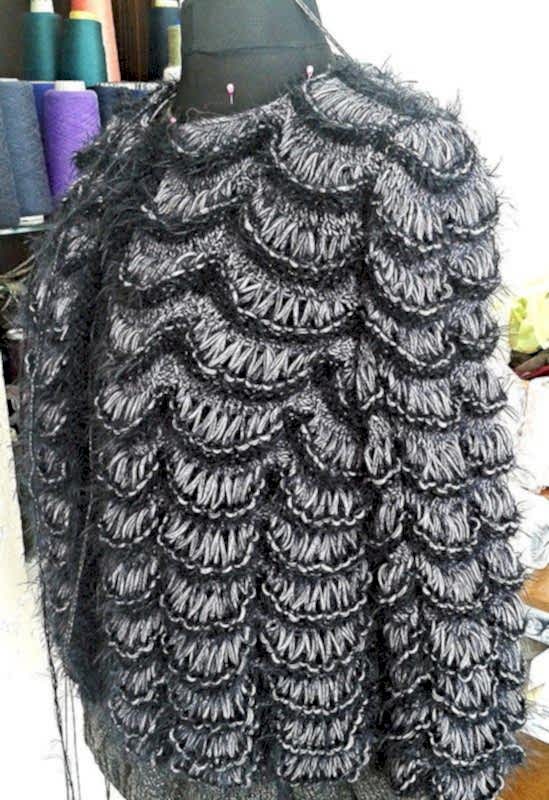 İlk olarak peluş iplik, siyah ve gri tonları ile örülmüş hırkaya göz atalım.